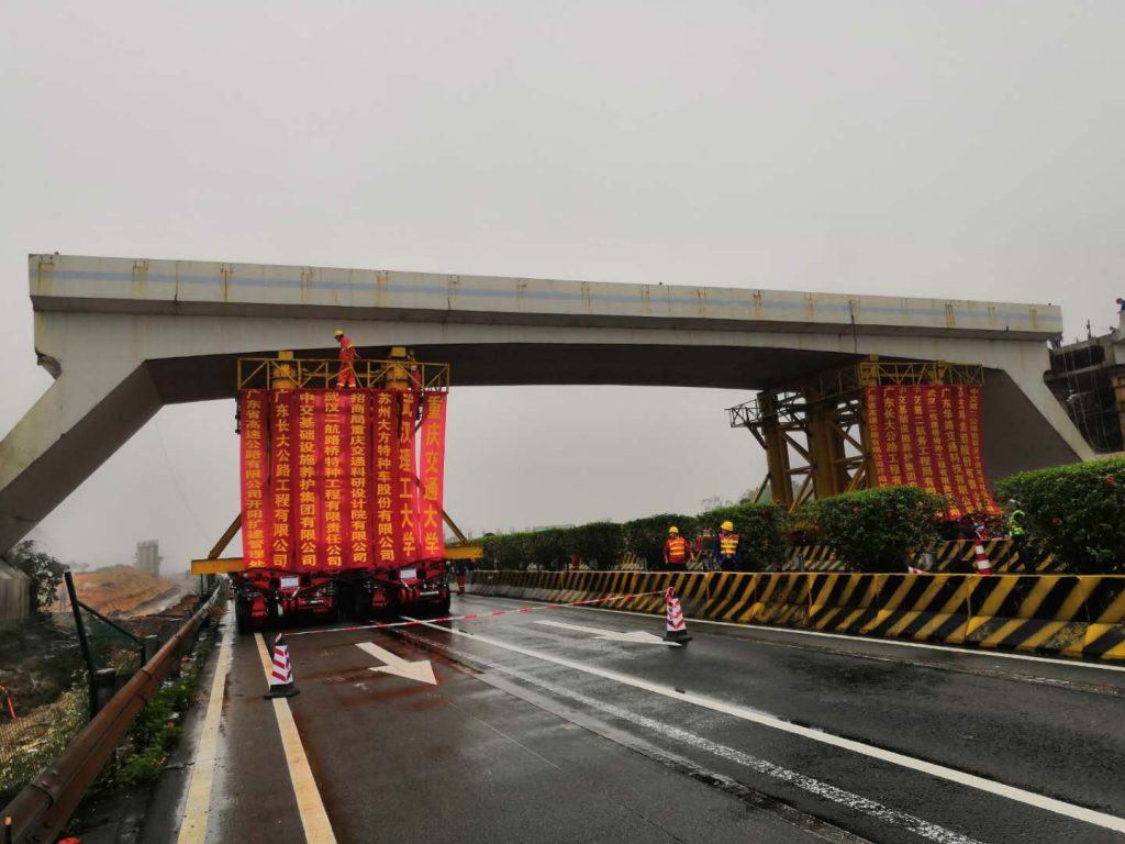 2019年4月16日上午,沈海高速(开阳段)3座天桥同一时间沿高速缓慢移动,开阳高速改扩建上跨天桥群快速拆除移运工程顺利实施。此次天桥群的移除最大移运重量850吨、最大移运距离365米,最短移除时间仅2小时,实现了行业内桥梁快速拆除的新突破,车辆系统运行可靠安全!